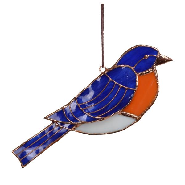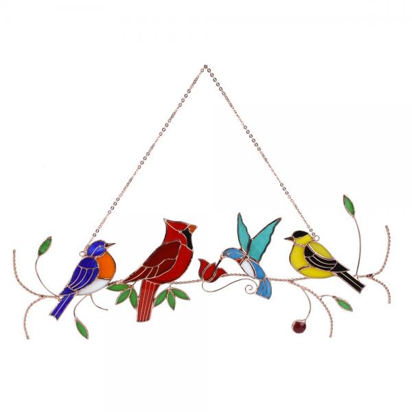 Celebrate all the birds! This beautiful suncatcher boasts 4 of the most popular, recognizable species. Made with hand cut stained glass, lead-free soldering and copper electroplate detailing. Hanging chain included....